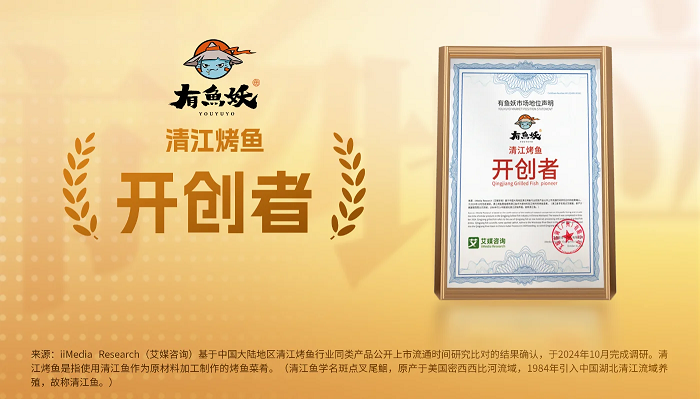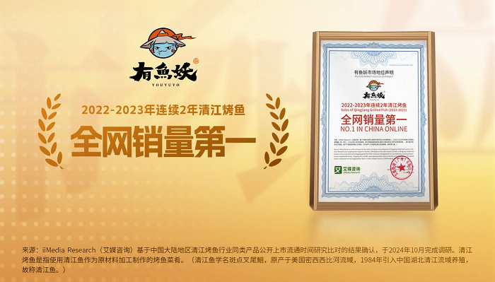 2024年10月,有鱼妖获全球新经济产业第三方数据挖掘和分析机构iiMedia Research(艾媒咨询)授予的“清江烤鱼开创者”“2022-2023年连续2年清江烤鱼全网销量第一”双项市场地位确认。