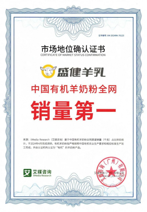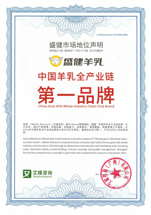 此次荣获“中国羊乳全产业链第一品牌”市场地位确认证书,不仅是权威机构对盛健羊乳过去努力的肯定,更是对盛健未来发展的激励。在羊乳制品行业快速发展的今天,盛健羊乳将持续坚守品质初心,深化全产业链布局,为消费者带来更多优质、健康的羊乳制品。