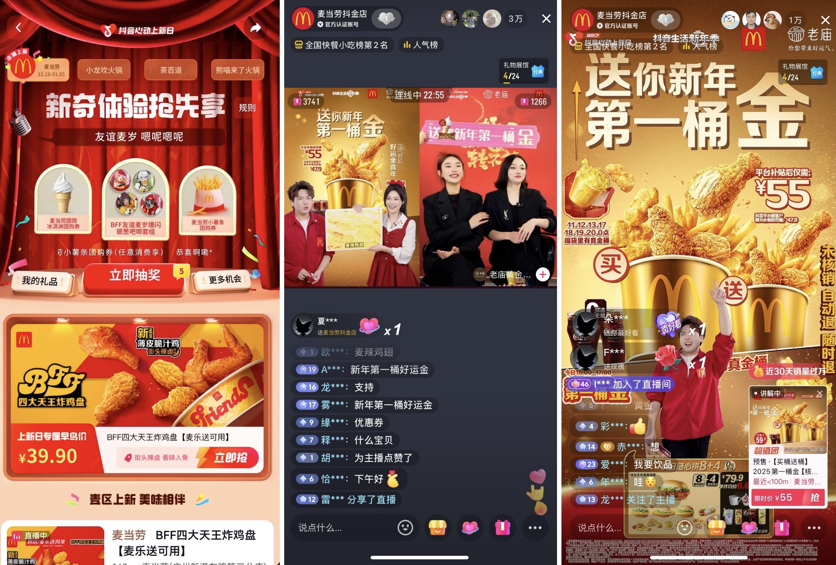 畅快体验了一把次元世界的刺激过瘾,转眼跨年钟声敲响,又迎来一波心动“金”喜。麦当劳与老庙黄金两大品牌官方直播间惊喜连麦,以“新年第一桶金”的新颖形式,为大家送上了“既要饱腹也要暴富”的诚挚祝福,实现了“抖金店实时场观破峰值”的佳绩。同时双品牌还在心动上新会场大方撒福利,将足量的“周边小金桶”作为互动任务的抽奖奖品,网友直呼:“中奖好运和新年好运全部都要,这奖我先抽为敬!”