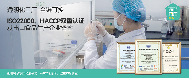 海蓝厨房海南椰子鸡能从地方特色风味走向全国,离不开其对文昌鸡、相关食材产业链及生产、配送的全链把控。海蓝厨房2020年打造出第一个自主食品加工厂,2022年在海南澄迈落地全新现代化食品加工厂,规模3500余㎡,获得HACCP、ISO22000食品安全管理双体系认证、出口食品生产企业备案,配置椰子水自动灌装生产线、-38°C速冻库、微生物检测实验室等,从椰子水自动灌装、文昌鸡分切加工、佐料生产到出厂检测实现自主可控,并通过食材原料进厂检测、生产过程检测、出厂检测、第三方检测等全方位检测保障产品安心品质,生产过程透明可见。