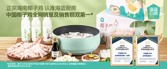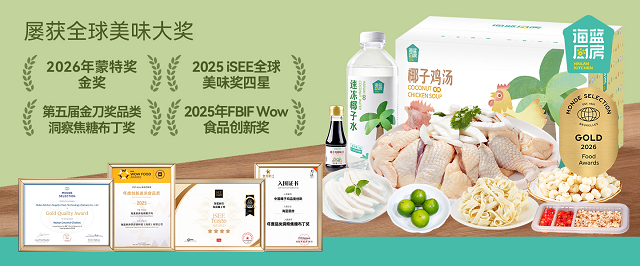 从2015年到2026年,海蓝厨房海南椰子鸡在电商及线下渠道持续增长,达到亿级品类规模,其椰子鸡单品仅在电商平台年销售量就超过百万份、复购率超过50%,2024年经CIC灼识咨询对于中国椰子鸡市场的研究,获中国椰子鸡全网销量、销售额双第一的市场地位认证,2025年获得iSEE全球美味奖四星、FBIF Wow食品创新奖双项食品行业大奖,此外,海蓝厨房品牌还获得2025年品牌星球奖年度创新品牌(成立十年以上组别)、金刀奖年度品类洞察焦糖布丁(JTBD)奖等殊荣,2026年海蓝厨房再获国际知名美味大奖蒙特奖(Monde Selection)金奖认证,意味着其品质与风味的高标准。