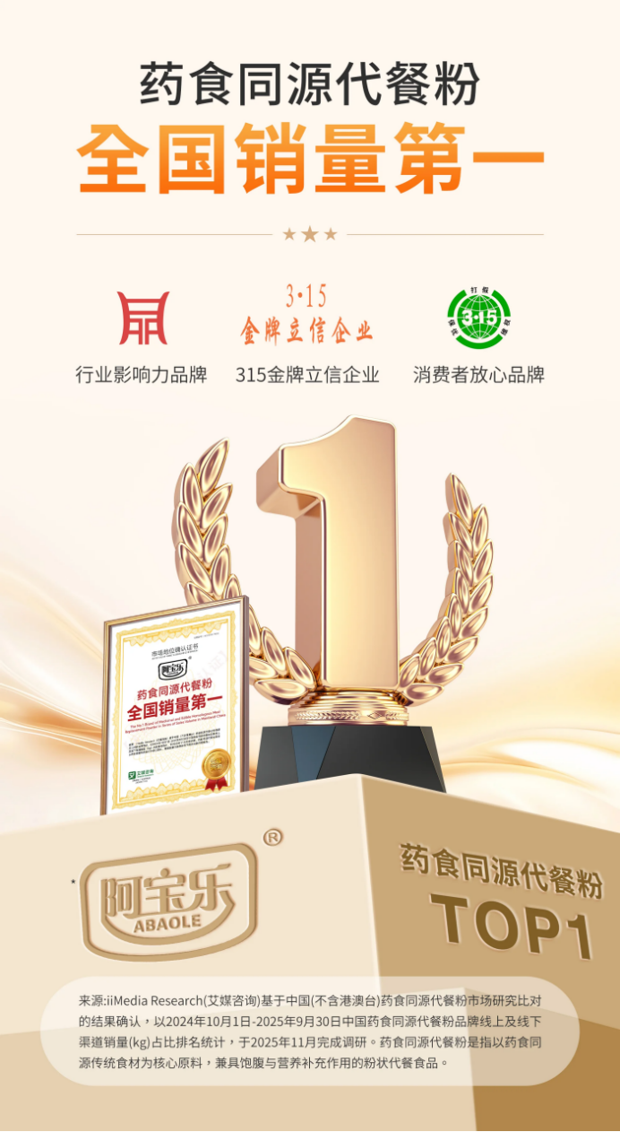 2025年11月,阿宝乐荣获全球领先的新经济产业第三方数据挖掘和分析机构iiMedia Research(艾媒咨询)授予的“药食同源代餐粉全国销量第一”“杏仁百合七白饮全国...